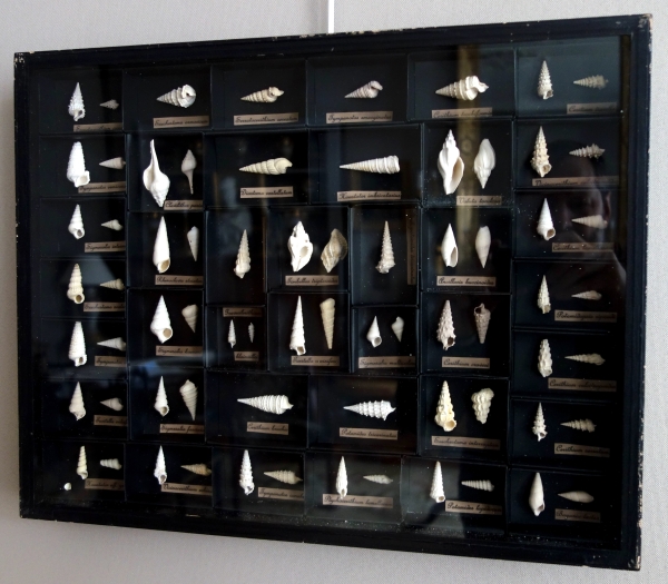 Exotic shells collection in a display box, each identified with its latin name underneath, meant to be place in a cabinet of curiosities. 20th century period in the taste of 19th century.