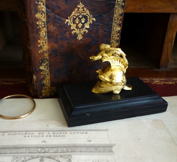 Empire Dragon officer helmet shaped ormolu (mercury gilt) paper weight on an ebony base, early 19th century.