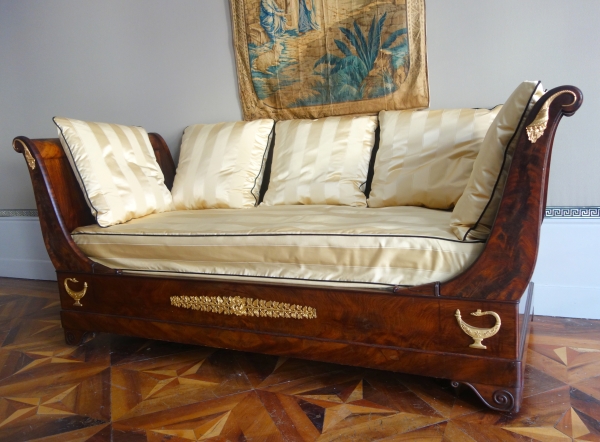 Empire Cuban mahogany sofa / bed, finely chiseled ormolu ornamentation, early 19th century circa 1830.