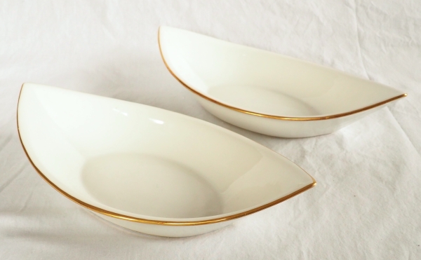 Pair of Empire Paris porcelain navette-shaped dishes enhanced with fine gold and its tray, early 19th century production circa 1800 - 1810.
