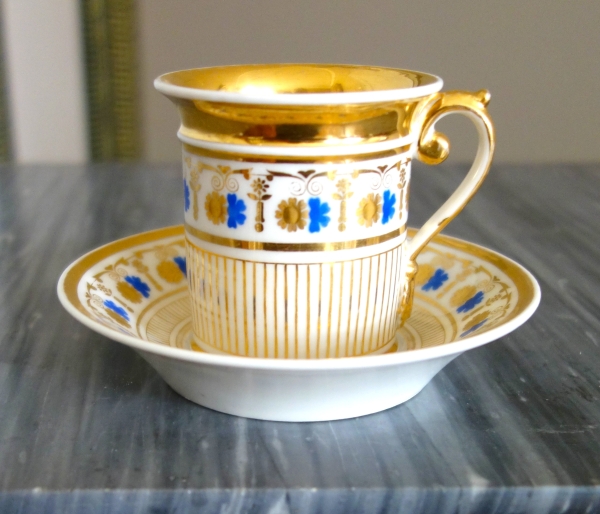 Empire Paris porcelain litron-shaped coffee cup enhanced with fine gold gilt patterns and a blue flowers frieze, 19th century circa 1820 - 1830.