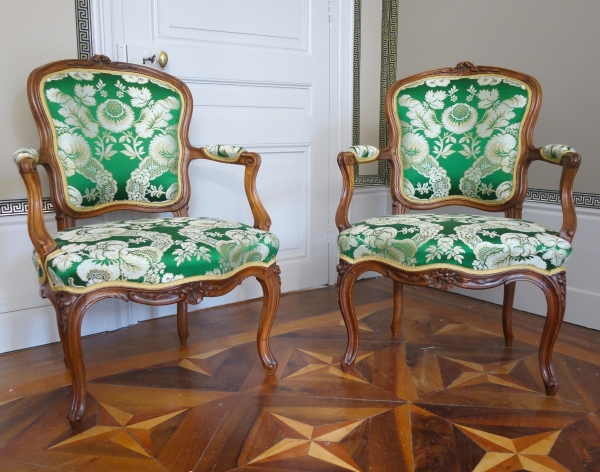 Pair of Louis XV period cabriolet armchairs, richly carved walnut seats, each sculpture is unique. One of them is stamped by Pierre Nogaret, most famous seat maker of Lyon. Mid 18th century circa 1760.