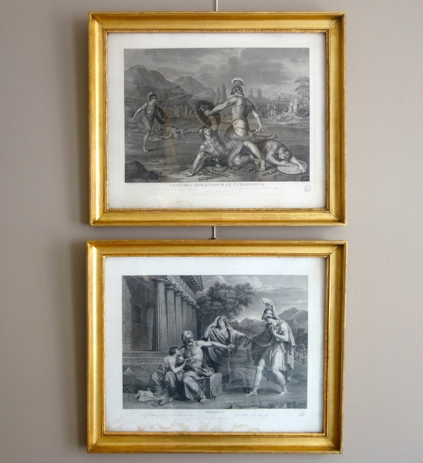Pair of large Empire engravings showing antique scenes set into their original gold leaf gilt wood frame, early 19th century circa 1820.