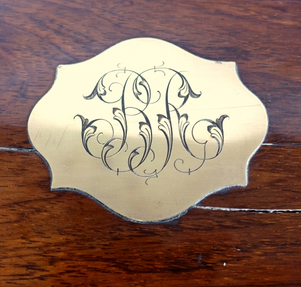 Large mid-19th century jewelry box circa 1840 - 1850, rosewood veneer, brass inlays, a BR monogram in the brass cartouche in the middle. Parisian production signed Maison Peret, rue Montmorency - Paris.
