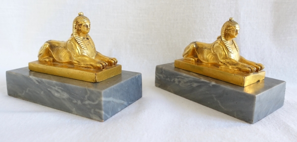 Pair of Empire paperweights, ormolu sphinges set on a blue Turquin marble base, early 19th century production.