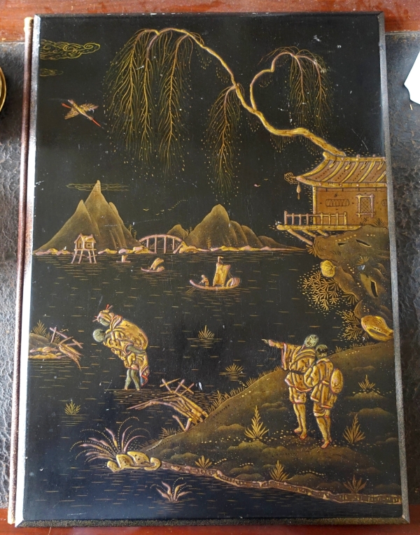 Large Japanese lacquer desk blotter on a leather frame decorated with gilt fishermen in a lacustrine landscape in relief. Circa 1900 or early 20th century.