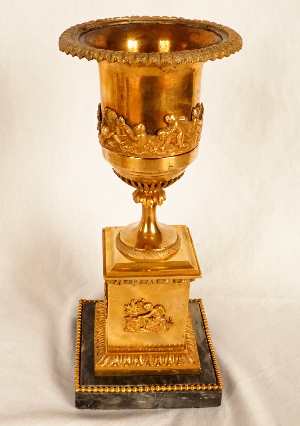 Large ornamental gilt bronze (ormolu) vase or cassolette decorated with a frieze picturing putti, standing on a turquin blue marble base.