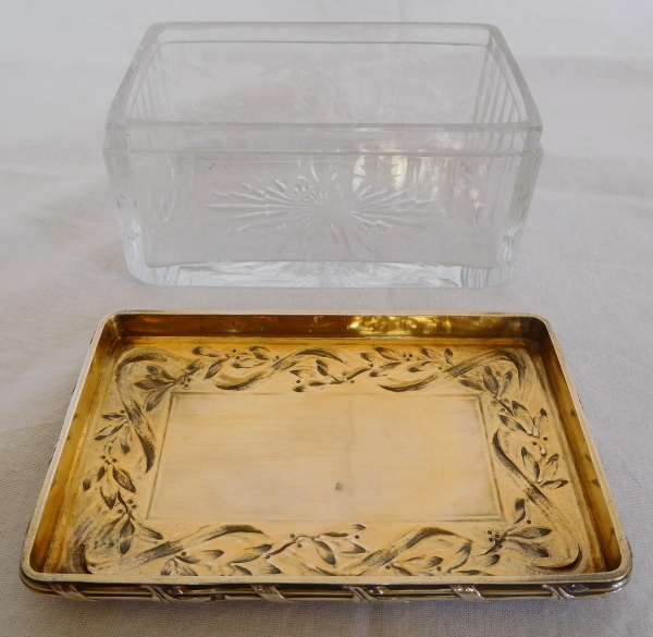 Luxurious late 19th century production, crystal finely decorated with Louis XVI style flowers and ribbons, the lid decorated with laurels, a crown of Prince engraved in the center, vermeil inside.