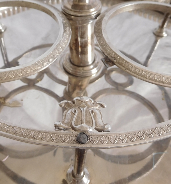It is composed of 12 crystal glasses and 3 crystal liquor bottles and a silver-plated frame with a dolphin and women busts shaped handle, typical of Charles X productions.