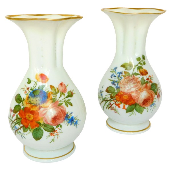 Opaline crystal vase decorated with hand-painted flowers, the edge enhanced with fine gold. 19th century Baccarat production circa 1840-50.