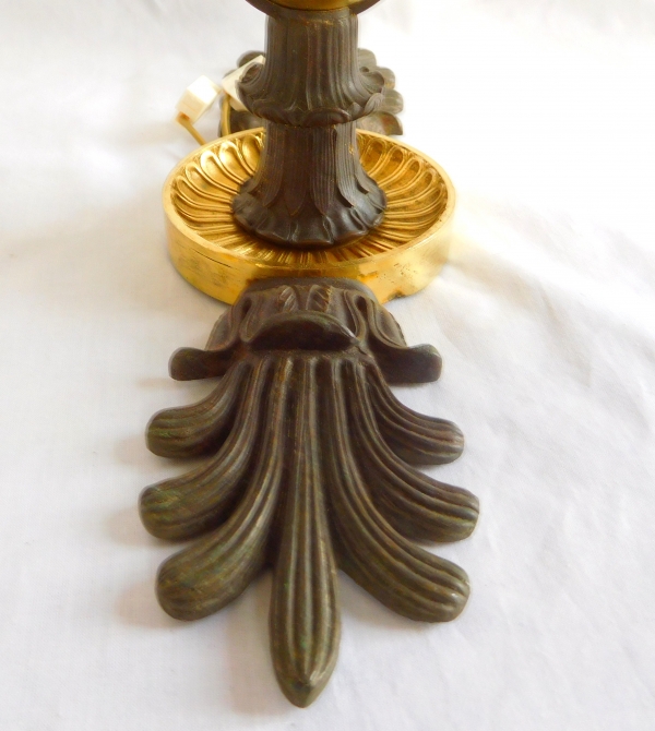Pair of large 4 lights ormolu (gilt bronze) and patinated bronze wall lights. Empire style, Restoration period - early 19th century circa 1830. Decorated with palmettes above and below the central sphere. Thomire produced wall lights of this type with this sphere mounting. It can be a production of Thomire & Cie or in the style of Thomire.