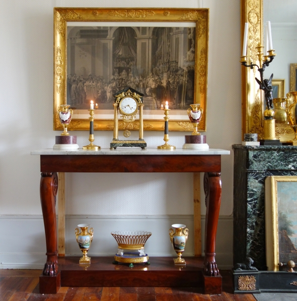 Pair of early 19th century patinated bronze and ormolu candlesticks, richly decorated pattern (palm leaves, grapes, ribs and fruits baskets) circa 1830.