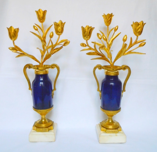 Pair of Louis XVI candelabras, Le Creusot blue glass, ormolu floral pattern and marble, 18th century.