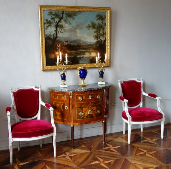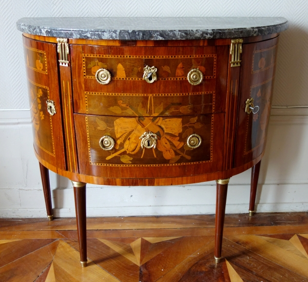 Louis XVI half-moon-shaped marquetry commode / chest of drawers, 18th century.