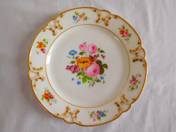 8 Paris porcelain dessert plates, beautiful handmade flowers decoration enhanced with fine gold in the taste of Jacob Petit, 19th century production circa 1840.