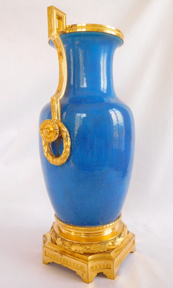 Tall ornamental Louis XVI style turquoise porcelain and ormolu vase, 19th century production attributed to Alfred Beurdeley.