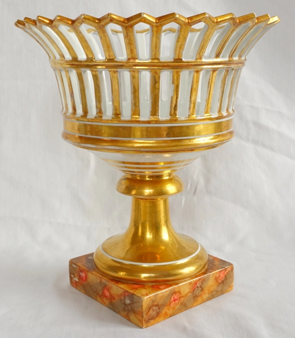 Empire Paris porcelain reticulated cup enhanced with fine gold, 19th century circa 1820-1830. Beautiful decoration enhanced with fine gold, pedestal simulating marble.