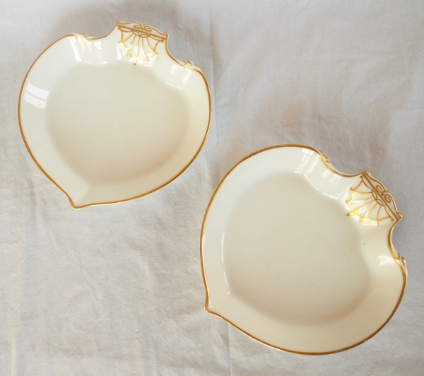 Pair of Empire Paris porcelain bread dishes enhanced with fine gold and their tray, early 19th century production circa 1800 - 1810.