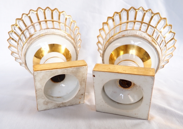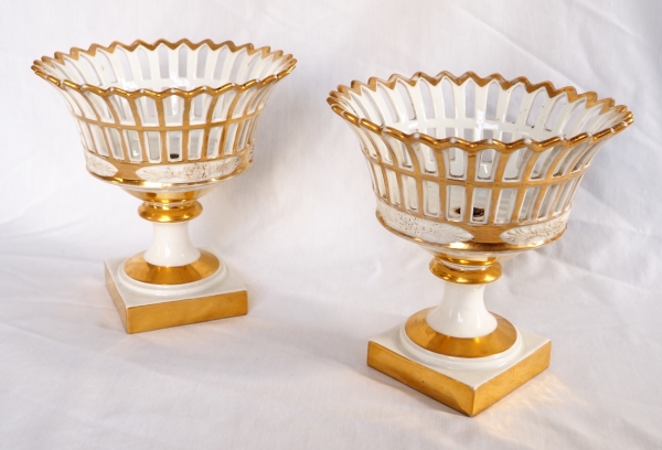 Pair of Empire Paris porcelain reticulated cups enhanced with fine gold, early 19th century production. Biscuit cartouches on the sides.