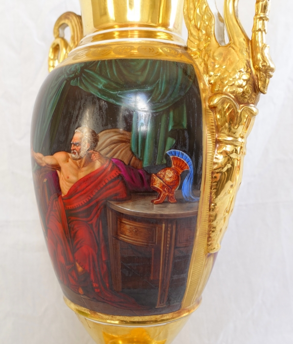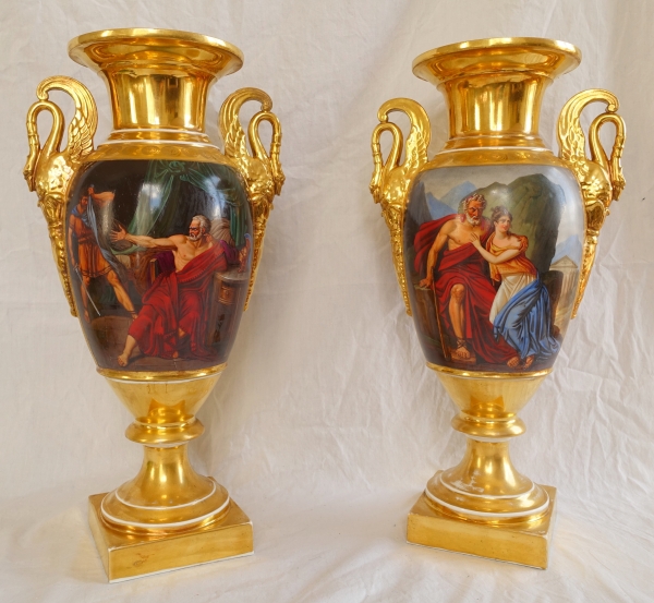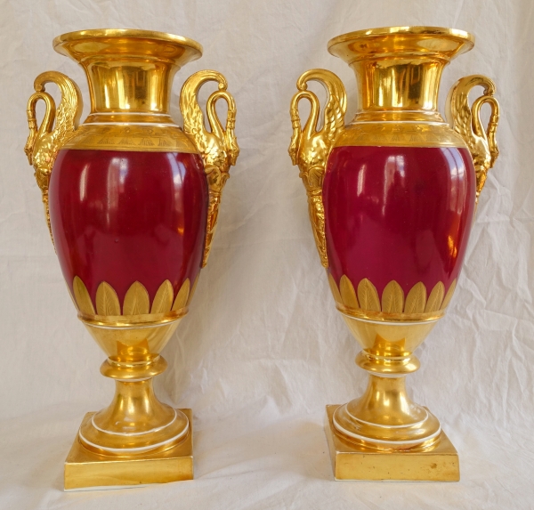 Pair of tall Empire Paris porcelain vases enhanced with fine gold decorated with polychromatic antique scenes, burgundy red background on the other side. Swan-shaped handle, matt and shiny finish. Beautiful Empire production, early 19th century circa 1810 - 1820.