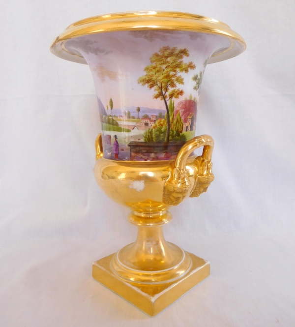 Pair of Empire Paris porcelain vases, refined ornamental model enhanced with a landscape polychromatic decoration. Beautiful gilt - matt and shiny finish - all over the vase, bearded men shaped handles. Early 19th century circa 1820.