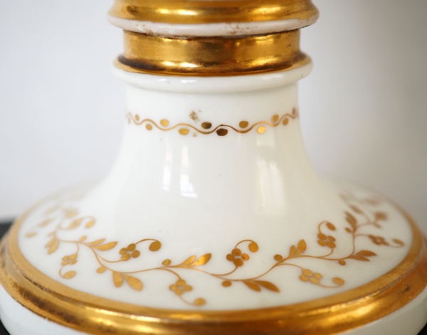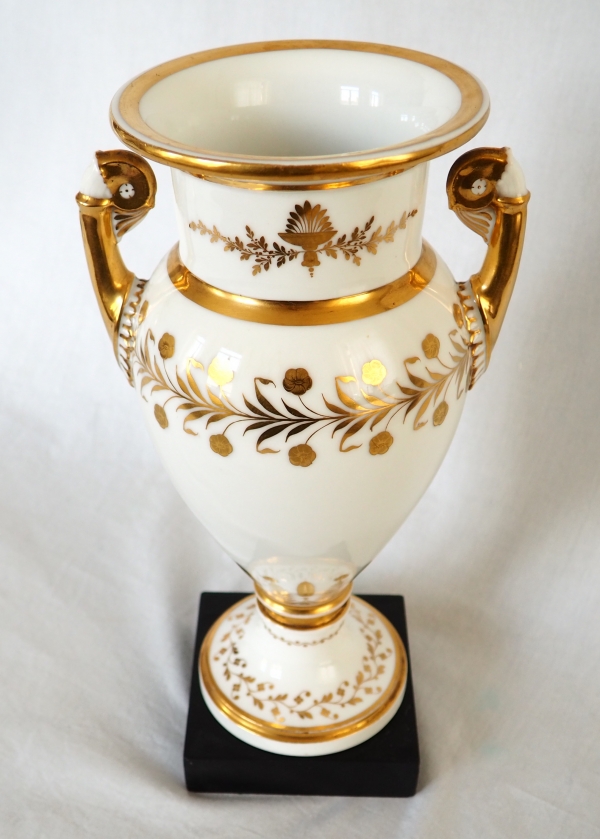 Pair of tall Empire ornamental vases, white porcelain enhanced with fine gold standing on a black squared marble base. Restauration production circa 1830 - 1840.