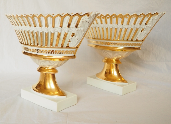 Pair of Empire Paris porcelain reticulated cups gilt with fine gold, large format, early 19th century circa 1810 - 1820, attributed to Nast. Refined finish with biscuit ornamentation, beautiful gilt.