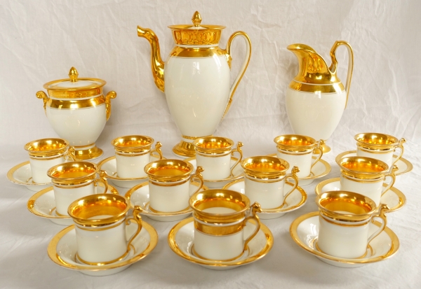 Paris porcelain Empire coffee set for 12, early 19th century production composed of a coffee pot, a sugar pot, a milk jug and 12 coffee cups and their saucer. Early 19th century production circa 1820 - 1830.