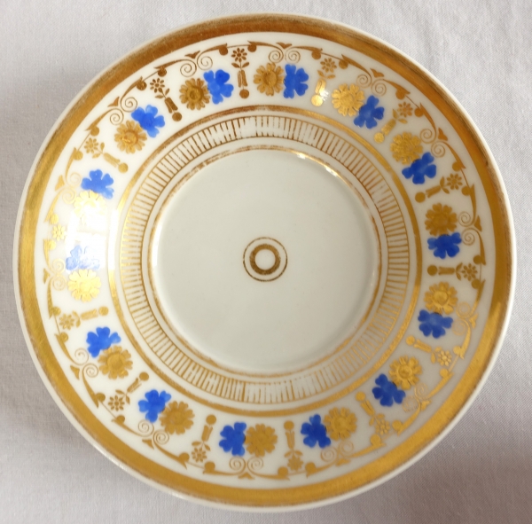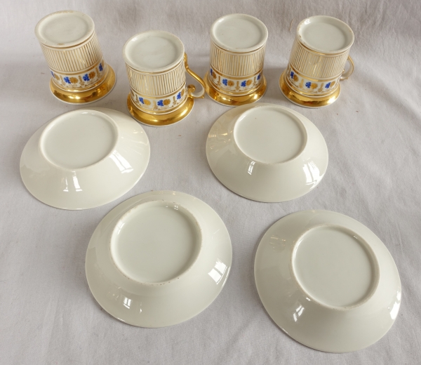 Empire Paris porcelain coffee set, 19th century fine production circa 1820 - 1830 enhanced with fine gold and blue flowers composed of a coffee pot, a sugar pot, a milk jug and 8 coffee cups with their saucer.