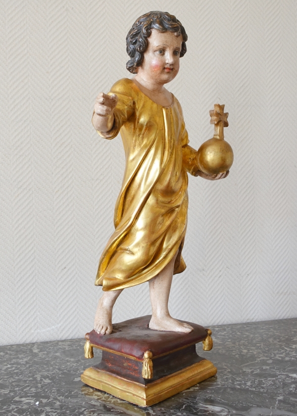 Jesus Child holding the orb, gold leaf gilt wood an polychrome statue, 18th century production.