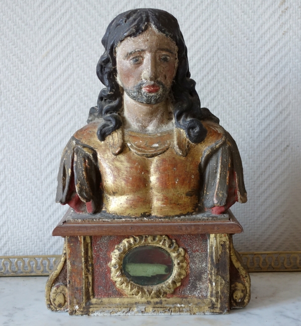 Pair of polychrome and gilt wood reliquaries, Louis XIV period, 17th century, a hollow to place relics in the baroque pedestals.