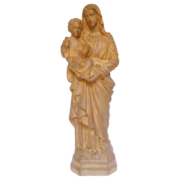 Virgin Mary and Jesus Child sculpture, grande statue XIXe en plâtre patiné terre cuite