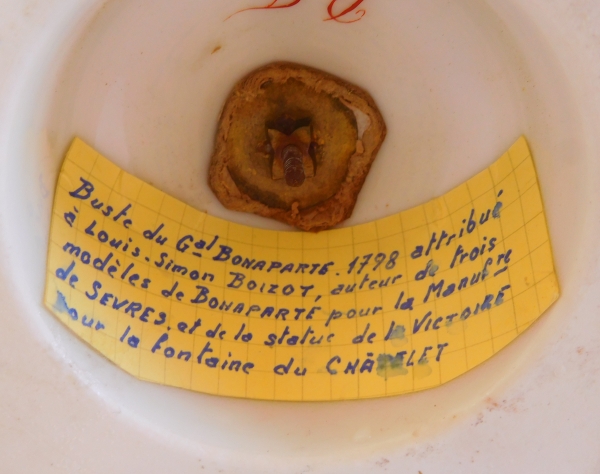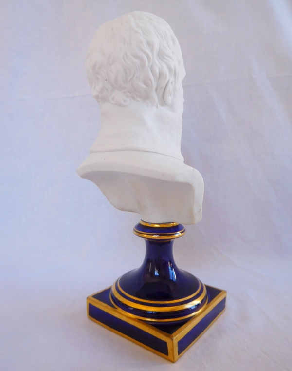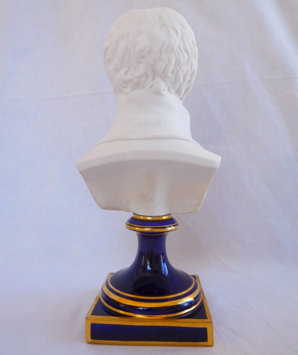 Porcelain biscuit bust of Consul Napoleon Bonaparte standing on a so-called bleu de four deep blue porcelain pedestal enhanced with fine gold titled Bonaparte.