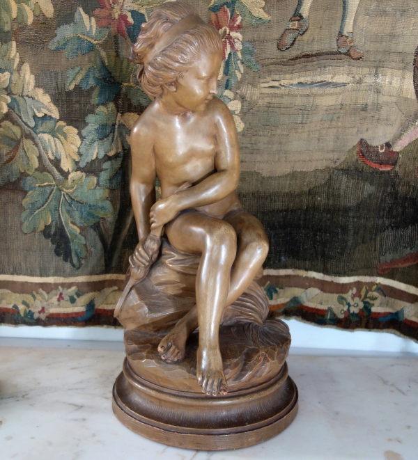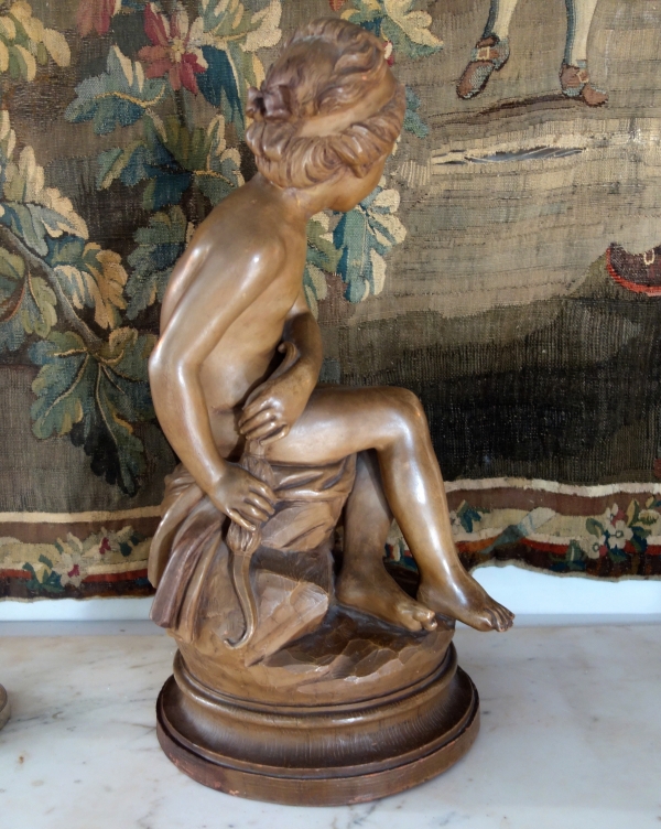 Tall patinated terracotta nymph after Falconet, 18th century style, late 19th century production or circa 1900. Falconet signature on the base.