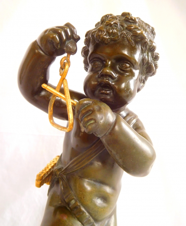 Pair of tall patinated bronze and ormolu musician putti, 18th century style (Louis XVI style) after famous French sculptor Clodion, early 19th century production circa 1830.