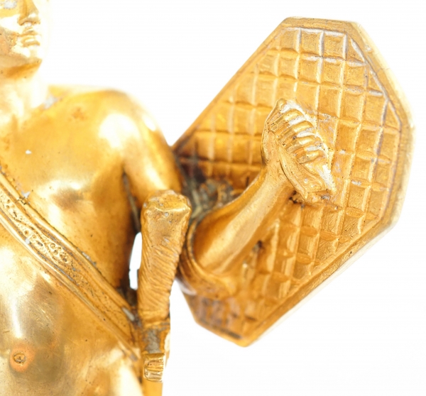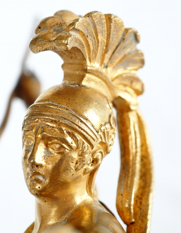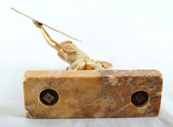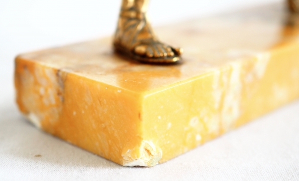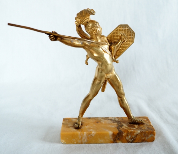 Bronze greek warrior shaped paperweight standing on a yellow Sienna marble base, Empire style 19th century production circa 1840 - 1850.