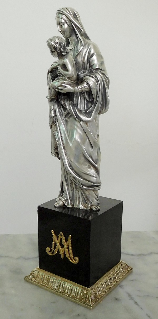 Statue of the Holy Virgin holding Jesus, silver plated bronze. French high quality work, 1840-1850's. The Virgin stays on a ebony base, decorated with bronze. Excellent condition.