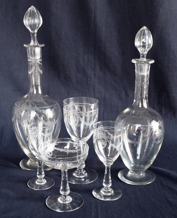 St Louis crystal champagne glass, Sapho pattern, Louis XVI style engraved decoration (garlands, ribbons, flowers and leaves)