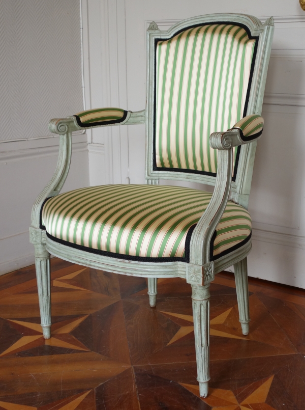 Set of 4 identical Louis XVI lacquered cabriolet armchairs, 18th century production not stamped, but undoubtedly the work of a great Parisian seatmaker - this we can tell according to the refined sculpture and perfect profile.