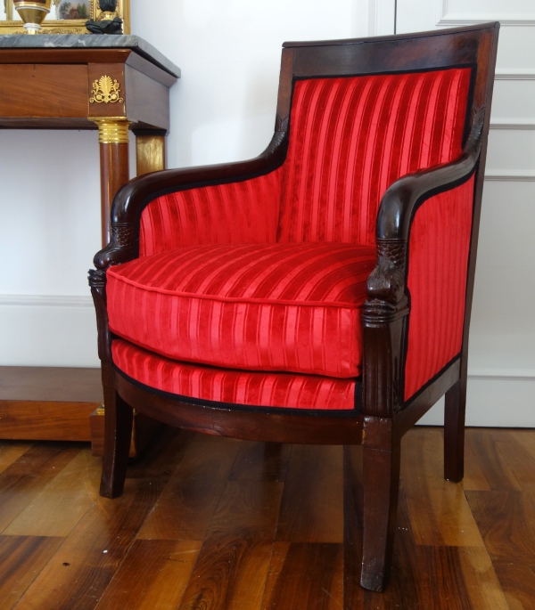 Empire mahogany bergere, dolphin-shaped armrests, early 19th century Parisian production circa 1810. A red striped velvet cover from French fabric manufacture Maison Lelievre.