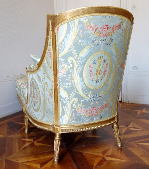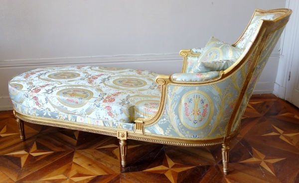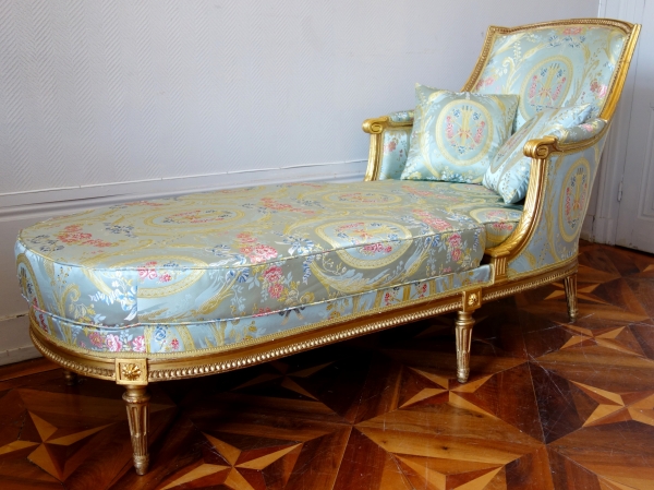 Louis XVI style long chair, gold leaf gilt wood, 19th century production.