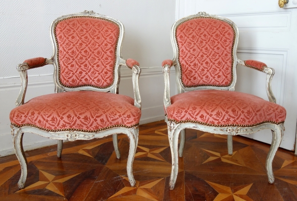 Pair of Louis XV lacquered cabriolet armchairs - mid-18th century production circa 1750 - 1760. Covered with a pink velvet.