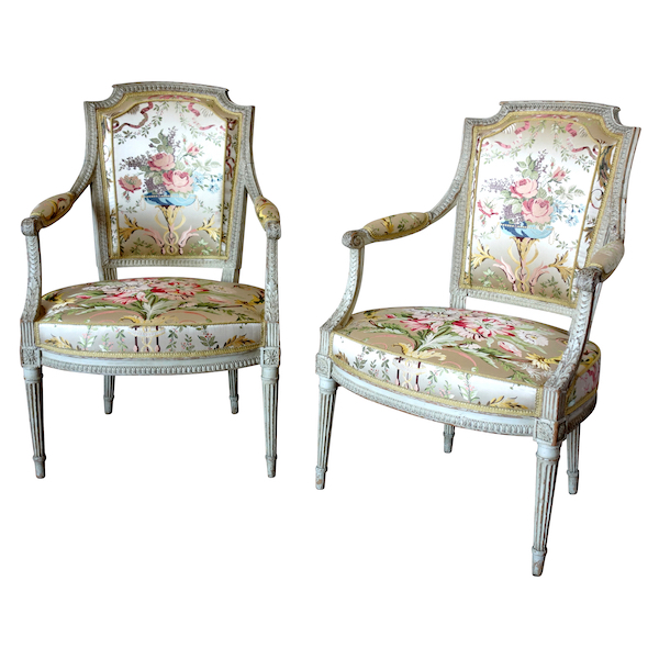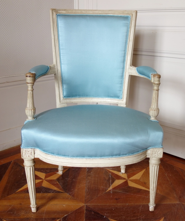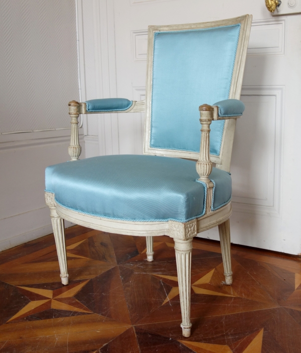 Pair of Louis XVI lacquered cabriolet armchairs covered with a fine blue silk, late 18th century circa 1785-90.