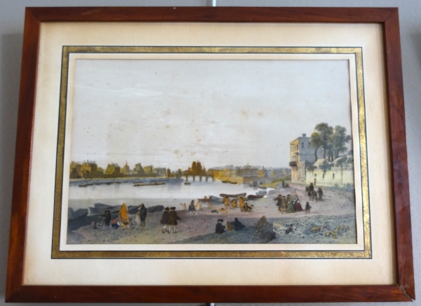 Set of 10 colourized lithographs / engravings showing Paris monuments, historical buildings and 19th century people. Set into solid mahogany frames (French varnish). Napoleon III period circa 1860.