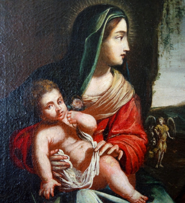 17th century French school : Holy Family running away to Egypt, large oil on canvas set into a 19th century Louis XVI style gold leaf gilt wood frame.