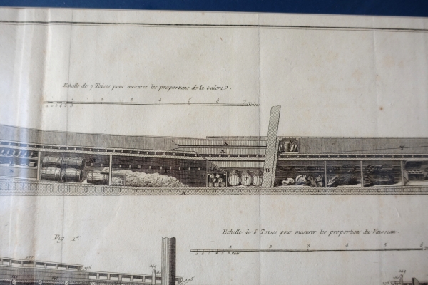 French Royal Navy vessel engraving, extract from 18th century Diderot Encyclopedia set into a Louis XVI style gold leaf gilt wood frame.
