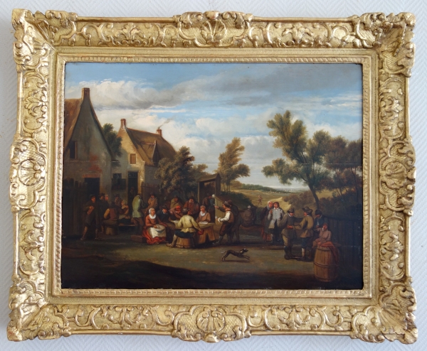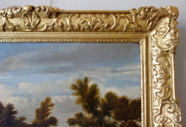Beautiful painting with a lot of picturesque details to look at, set into a Louis XIV gold leaf gilt wood frame.