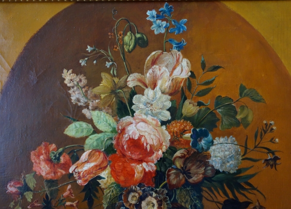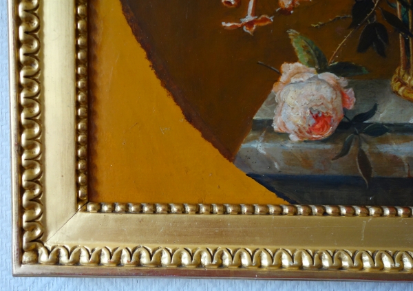 Early 19th century French school, large oil on canvas, still life : bouquet of flowers in a basket circa 1800, set into a beautiful gold leaf gilt wood frame (early 19th century as well).