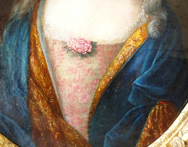 Early 18th century French school, large portrait of an aristocrat (or a Princess since she is wearing a fleur de lys accessory in the hair) - Louis XIV painting circa 1700, oil on canvas set into a superb Louis XIV oval gold leaf gilt wood frame.