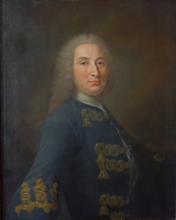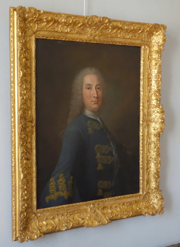 18th century French school : Regency - Louis XV portrait of an aristocrat, oil on canvas set into a 19th century Regency style gold leaf gilt wood frame.